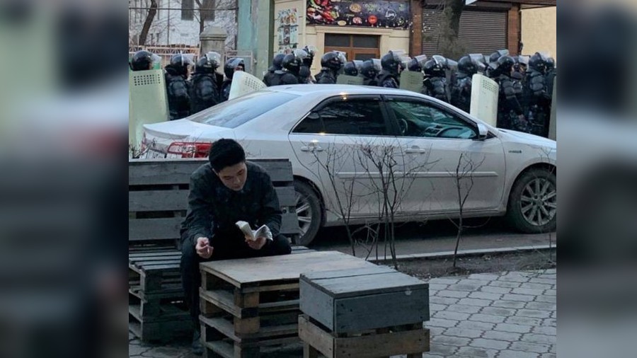 Сүрөт — Митингчилерди таратып жатканда китеп окуп отурган жигит