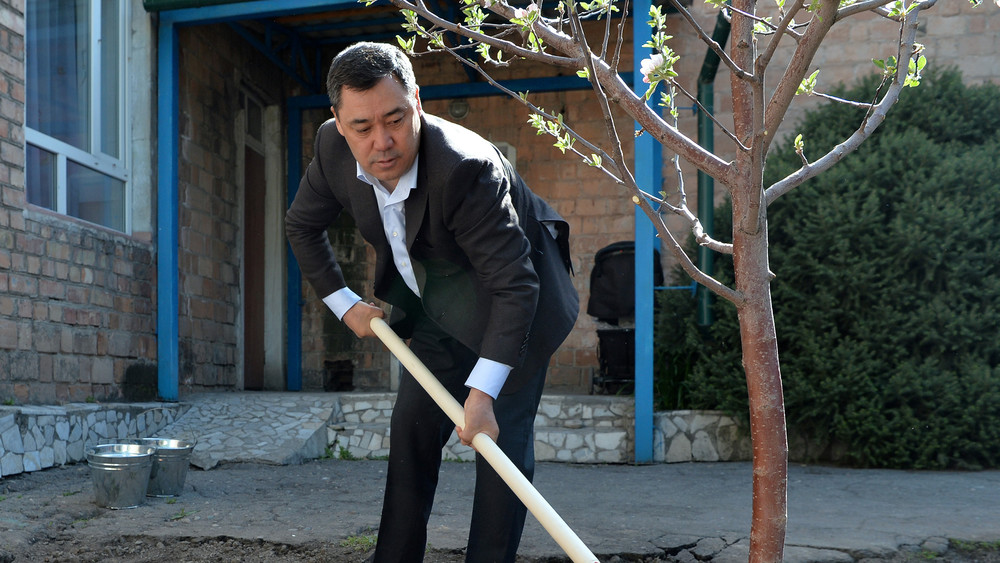 Садыр Жапаров «Эскерүү багы» акциясынын алкагында Бишкектеги балдар үйүндө көчөт отургузду